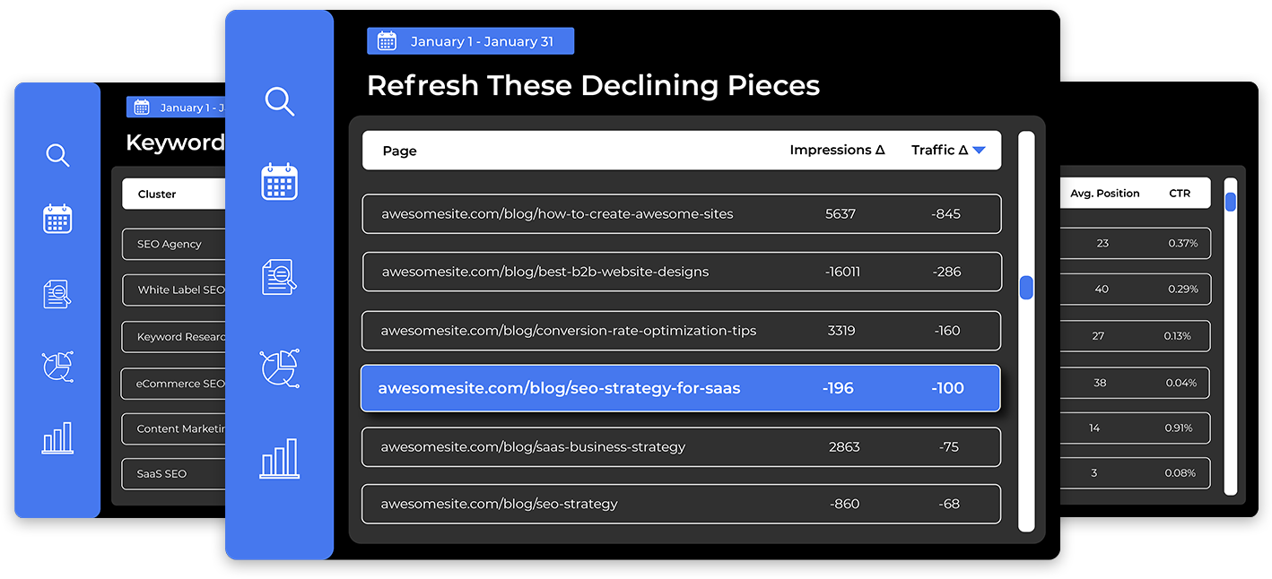 Our software is built to be useful without hands-on assistance. That’s why we developed very actionable reports e.g. “refresh these declining pieces”. But we do also offer a Content Strategy Service for a handful of clients at a time.
